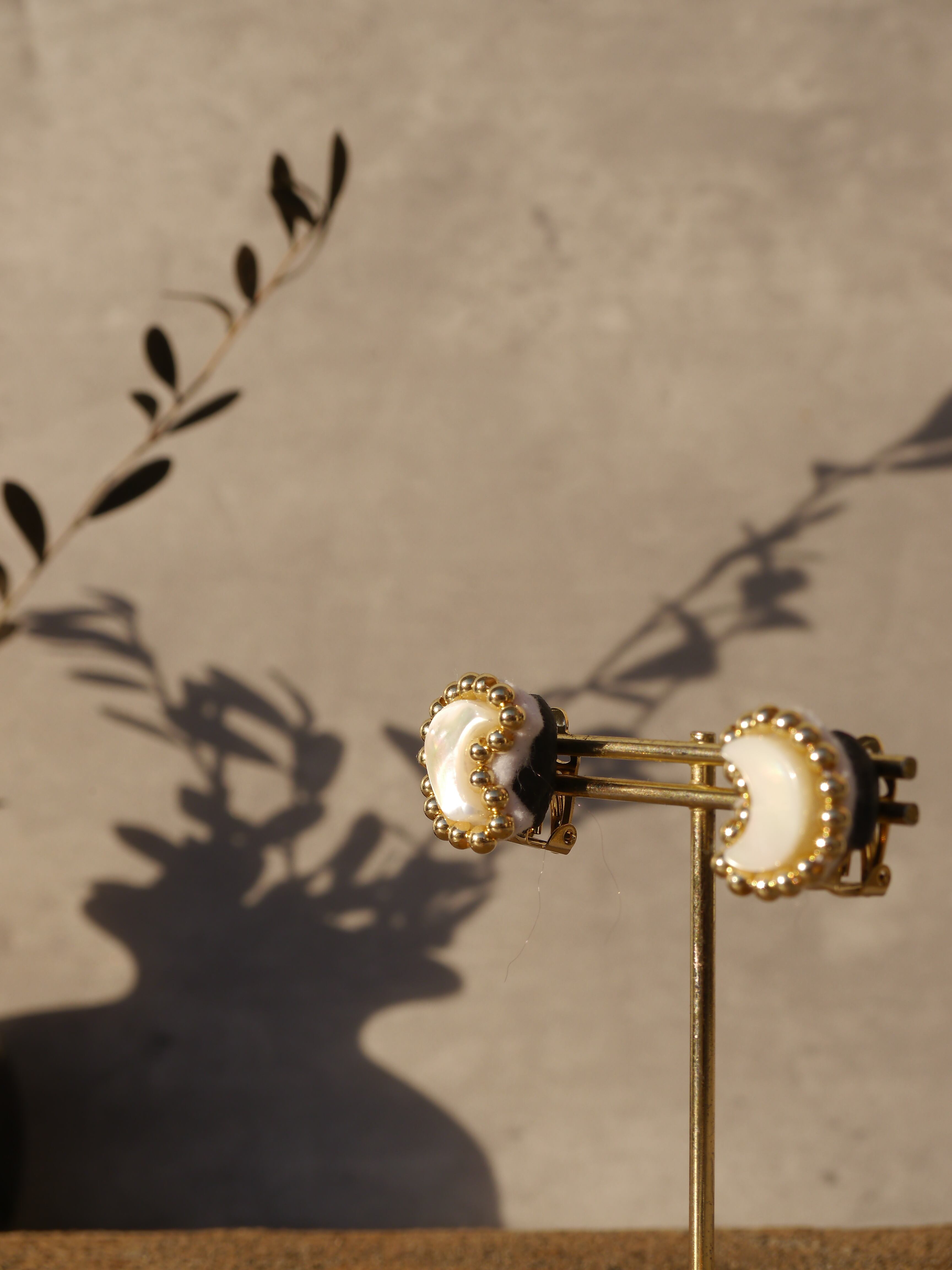 約15ミリ小ぶりサイズの月形のシェルにステンレスビーズを縫い付けております。