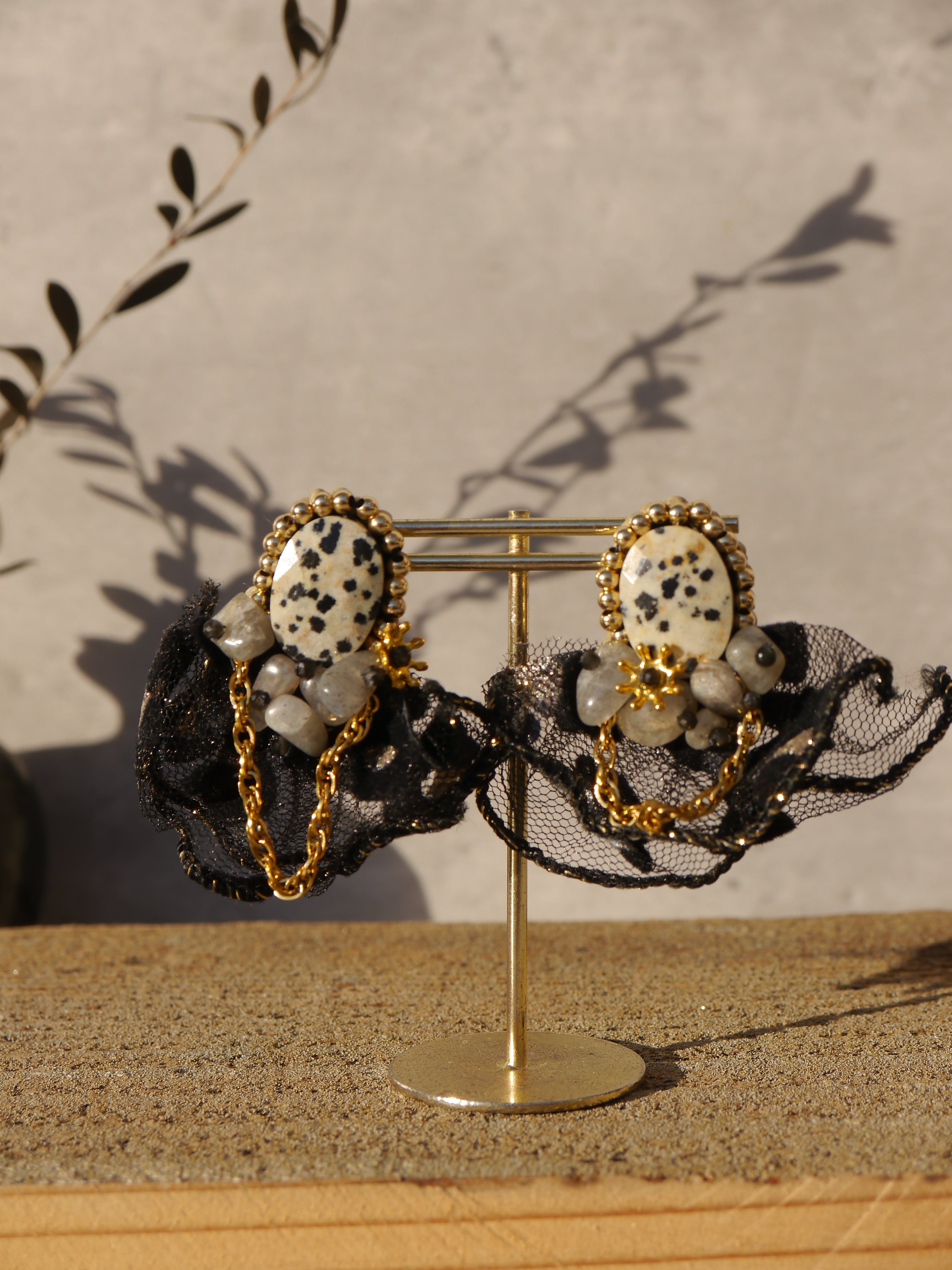ダルメシアンジャスパーにビーズを刺繍したピアスです。