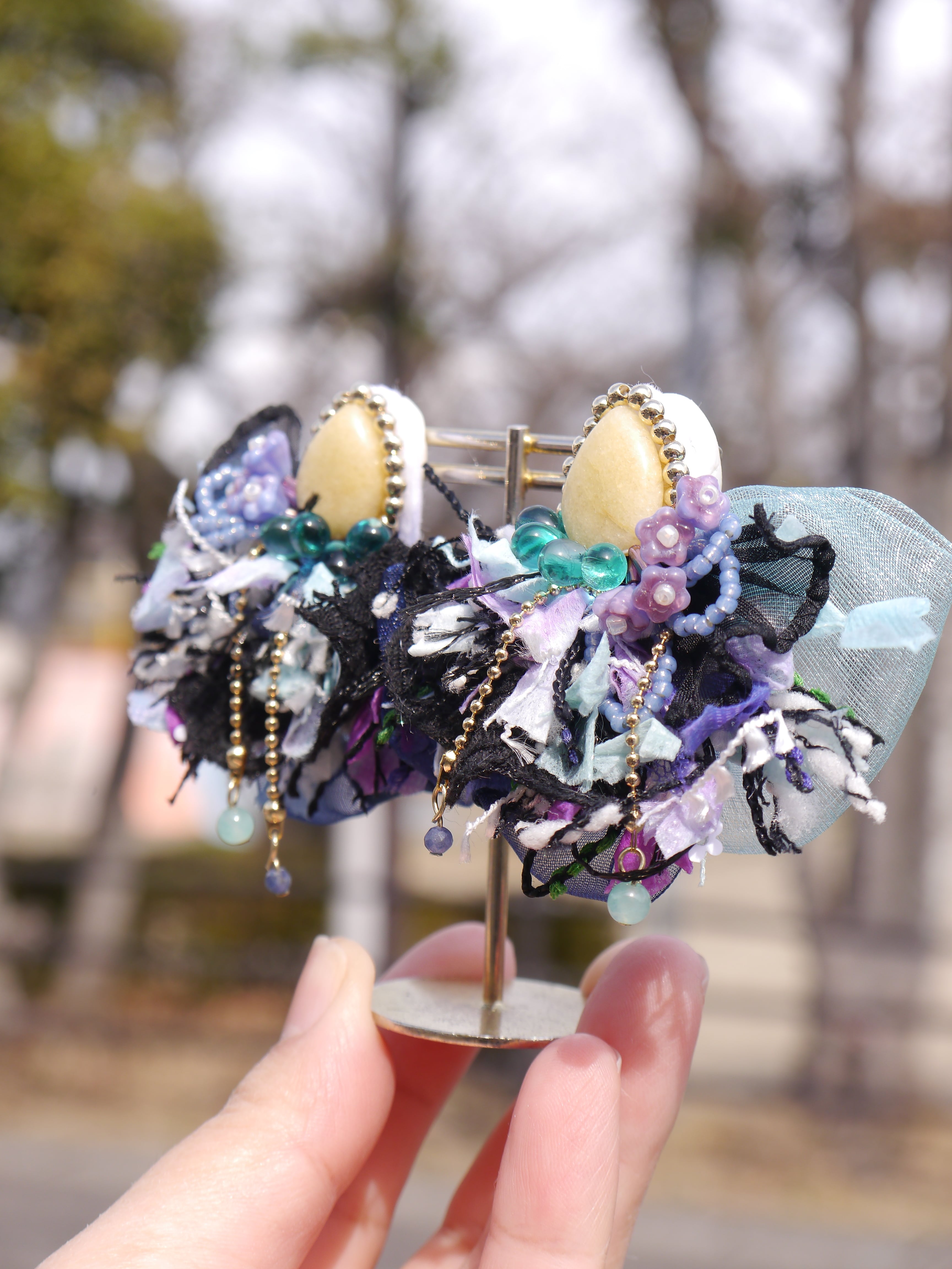 シトラスイエローのトパーズにビーズを刺繍したピアスです。